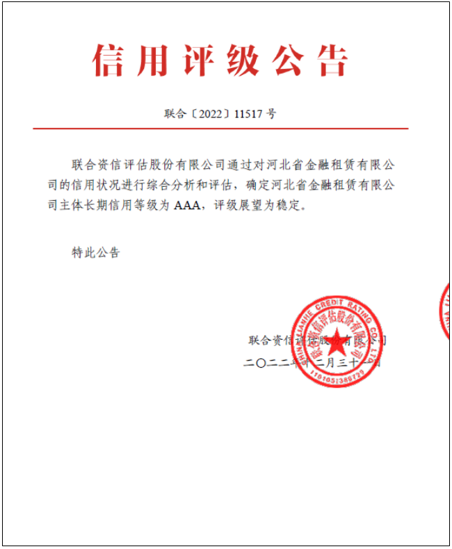 微信圖片_20230110194837.png       雙AAA!日前,河北省金融租賃有限公司正式獲得聯合資信評估股份有限公司AAA主體長期信用等級,加上此前持有的中誠信國際信用評級有限公司AAA主體長期信用等級,成為首家獲得雙AAA主體信用等級的金租公司,為自身持續優化融資結構、拓展融資渠道、提升信用形象奠定了基礎。